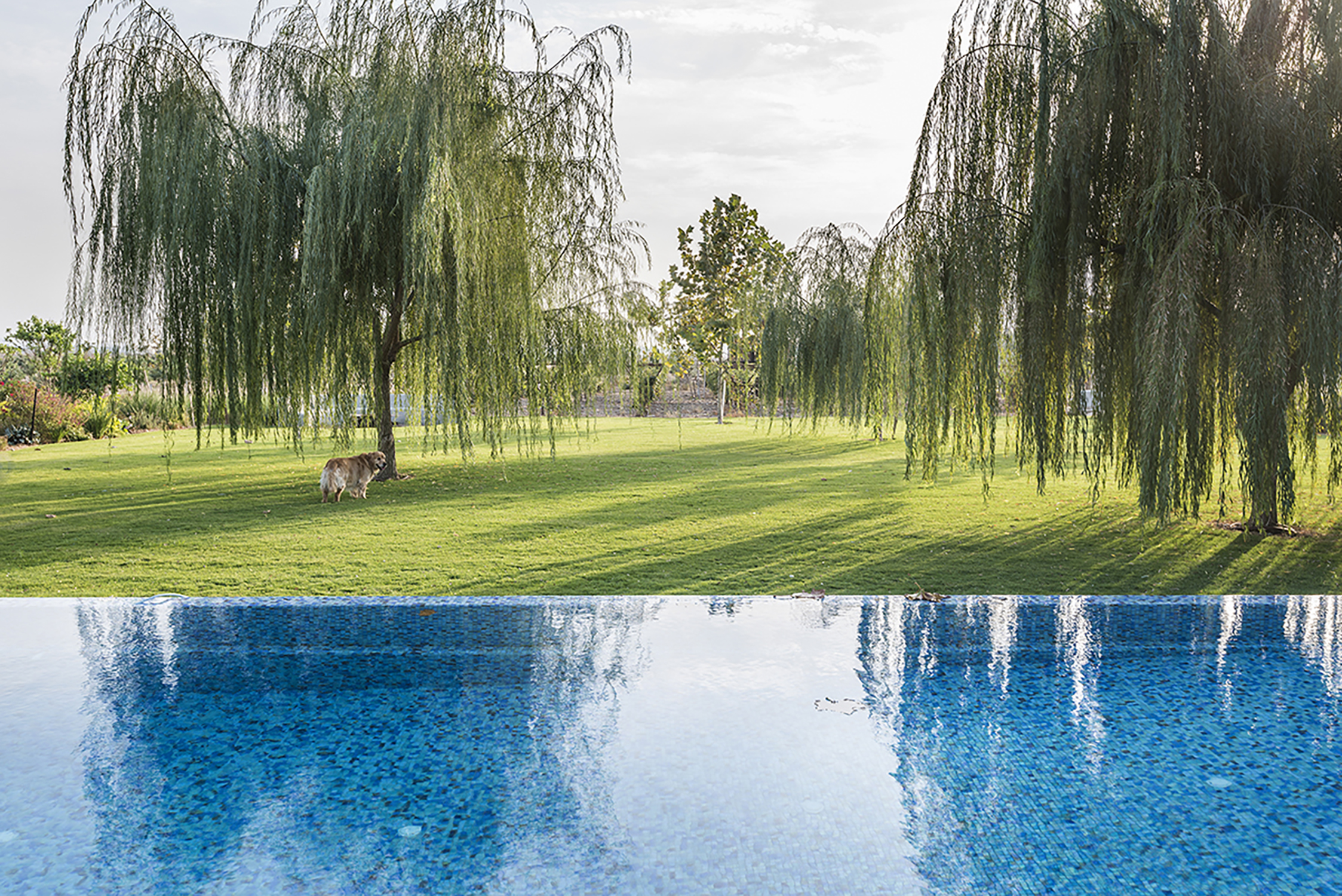 מדשאה רחבה נפרשת אל עבר קו האופק, מדגישה את תחושת הפתיחות ומקשרת בין הבית לבין הנוף הכפרי שמסביבו. הגן כולו מעורר תחושת רצף בין טבע מעובד לנוף פראי יותר, תוך שמירה על קווים נקיים וחיבור רגשי לאדמה.