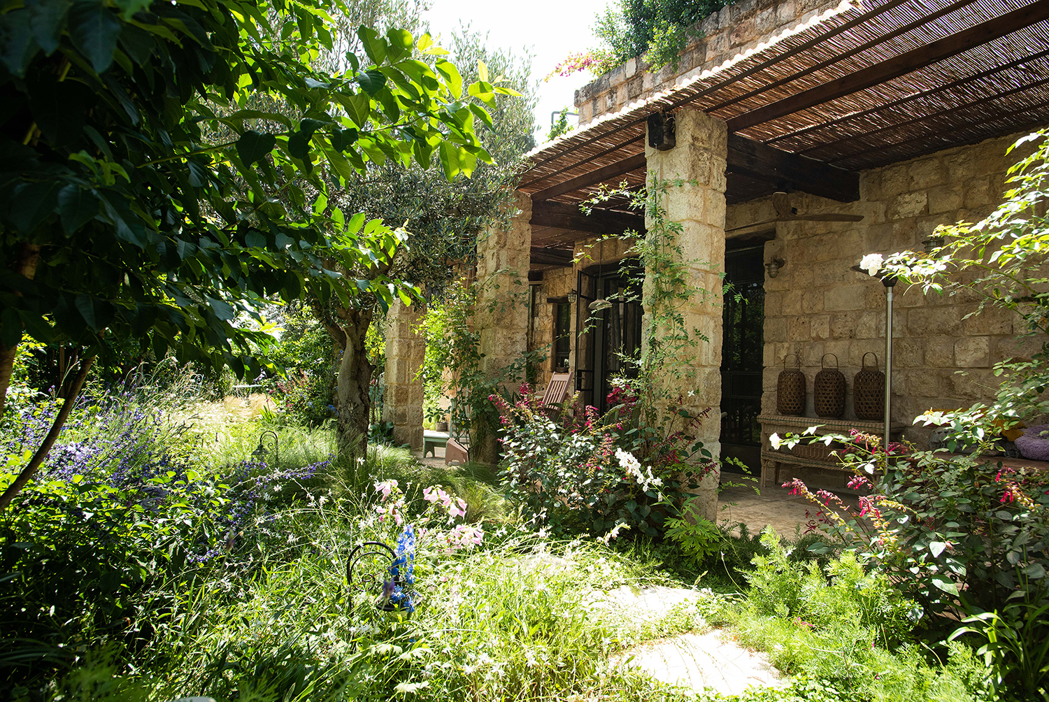 בפינה שקטה בסמטה כפרית ניצב בית אבן מוקף בגן המשחזר את רוח הבוסתן הארץ־ישראלי. השבילים הטבעיים חוצים את המגרש ומאפשרים הליכה בתוך הצמחייה, כמעט כמו טיול בשטח פתוח. עצי הזית — שהובאו בוגרים היישר מהמטע — מהווים את המוטיב המרכזי ומגדירים את האופי הראשוני של הגן.